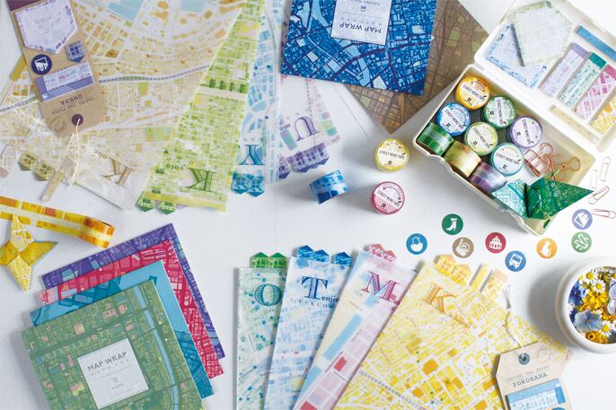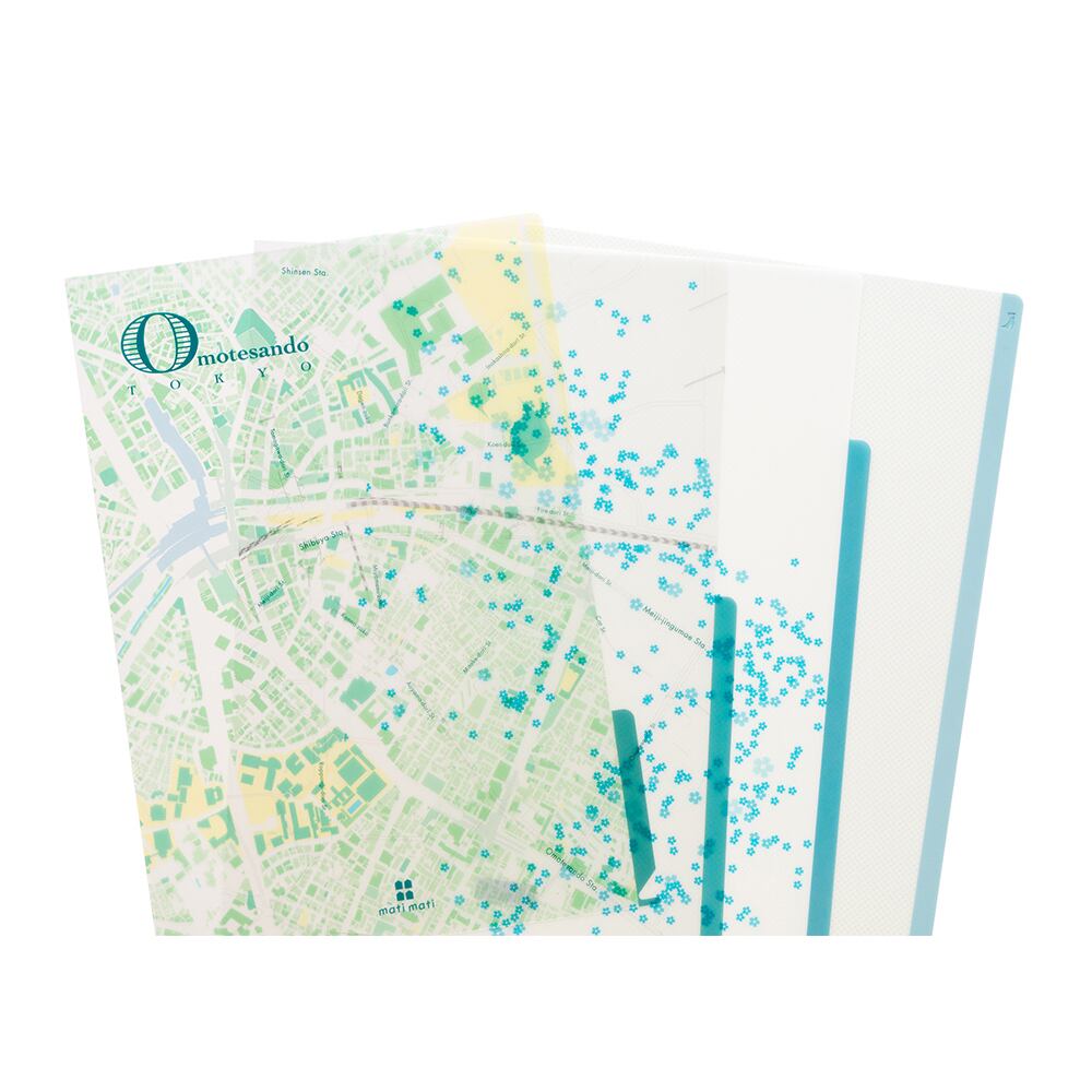 表参道の地図をデザイン化した、「mati mati」シリーズのクリアファイル、ノートパッド、ブックマーク、マスキングテープ、ふせんのセットです。