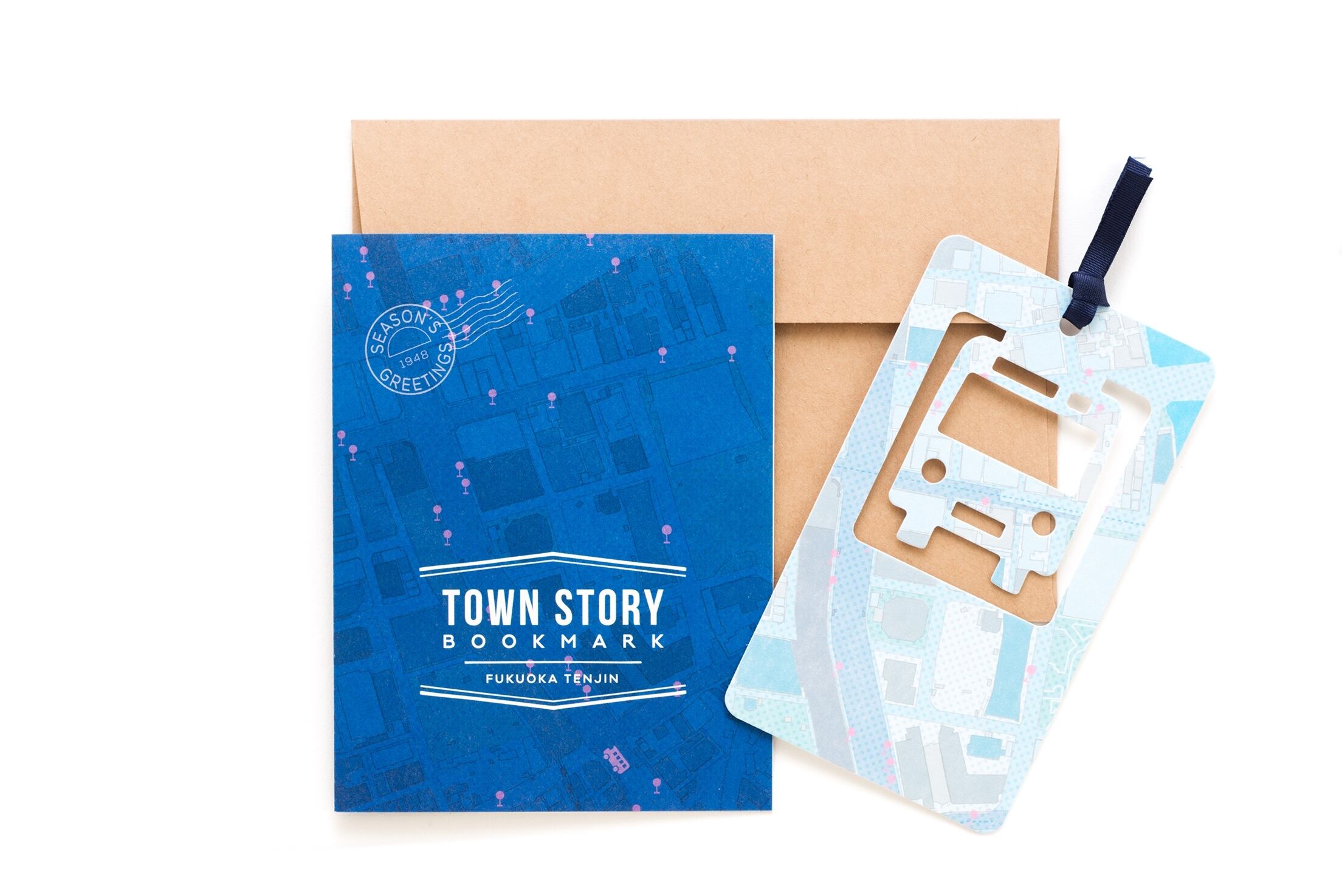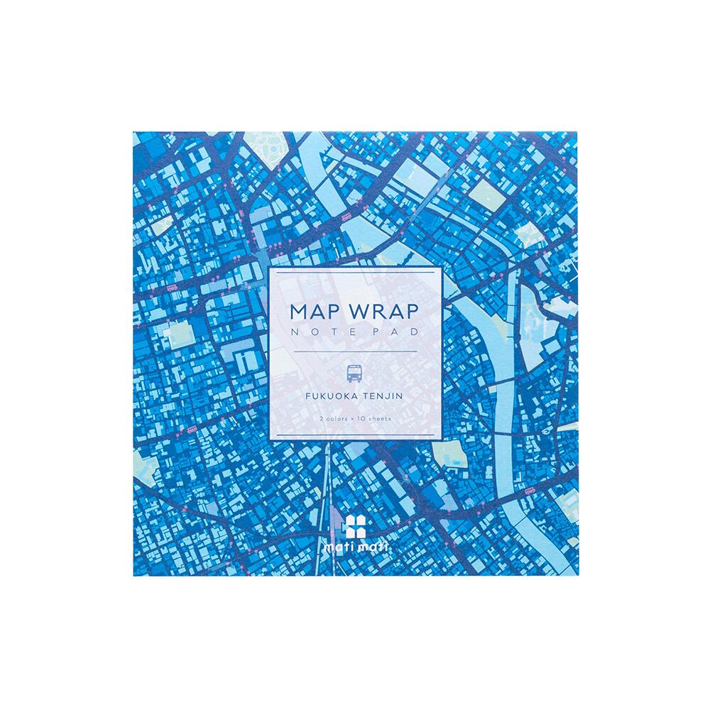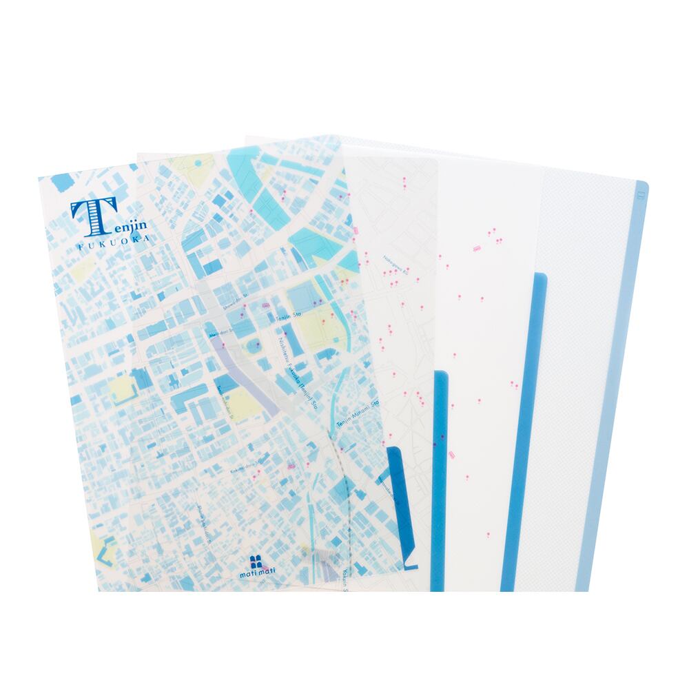 福岡・天神の地図をデザイン化した、「mati mati」シリーズのクリアファイル、ノートパッド、ブックマーク、マスキングテープ、ふせんのセットです。