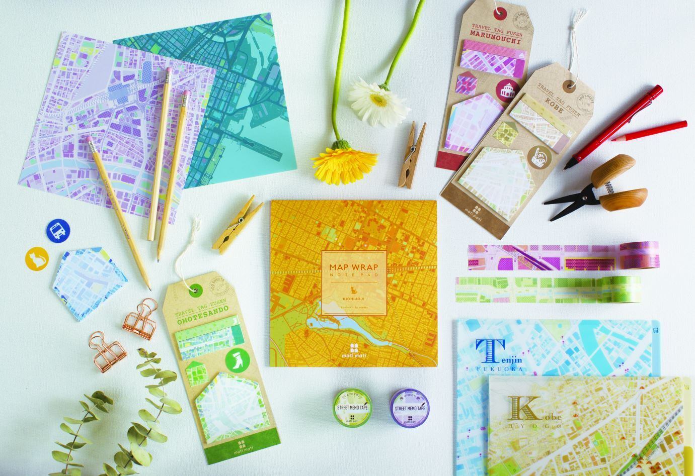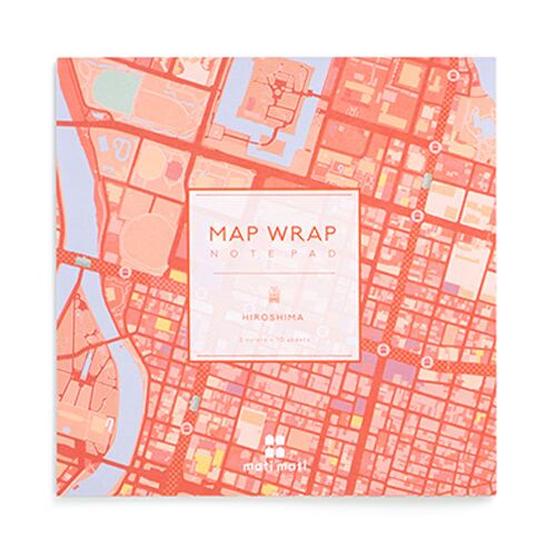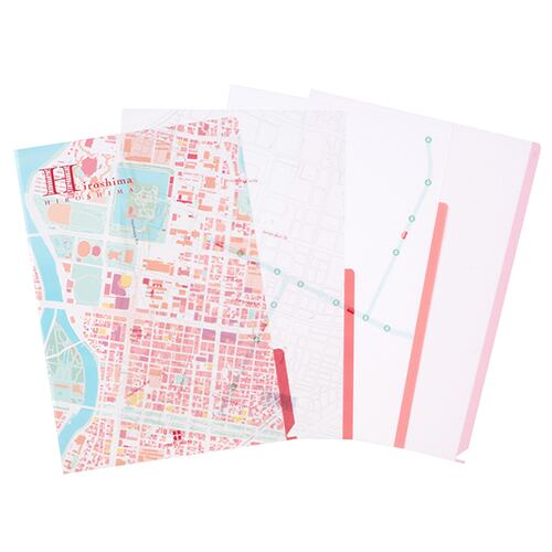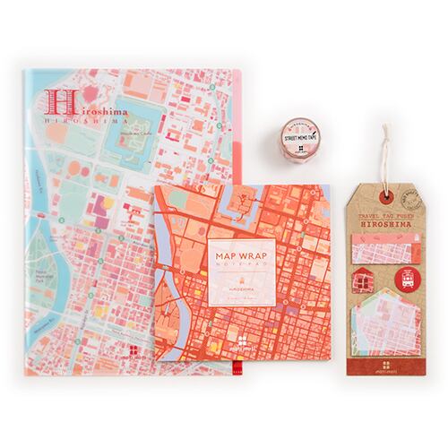 広島の地図をデザイン化した、「mati mati」シリーズのクリアファイル、ノートパッド、マスキングテープ、ふせんのセットです。
