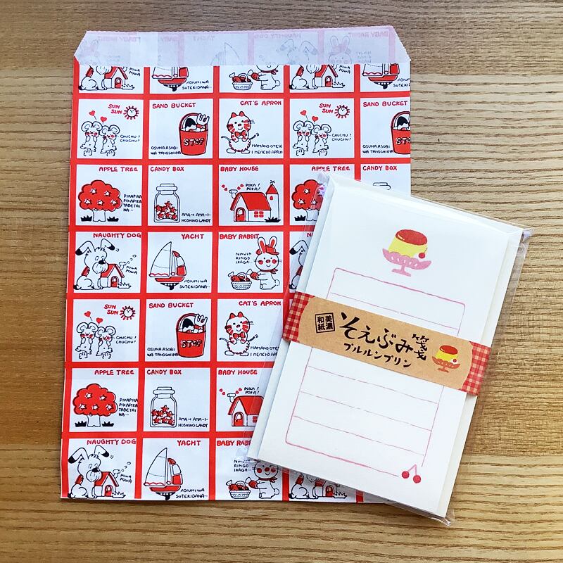 どこか懐かしさを感じるレトロなデザインで、手描きのイラストと文字を活かした何ともファンシーな紙袋です。ペンや小ぶりなノートが入るくらいの大きさです。
