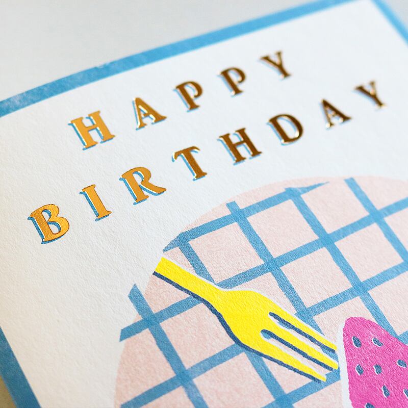 まるで外国のイラストレーターが描き下ろしたようなタッチで、様々なケーキを華やかに描きました。文字の部分に金箔押しが施されています。