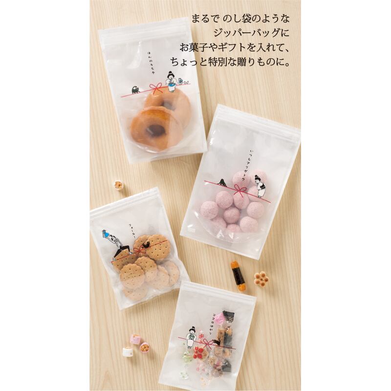 まるでのし袋のようなジッパーバッグにお菓子やギフトを入れて、ちょっとした贈りものに。